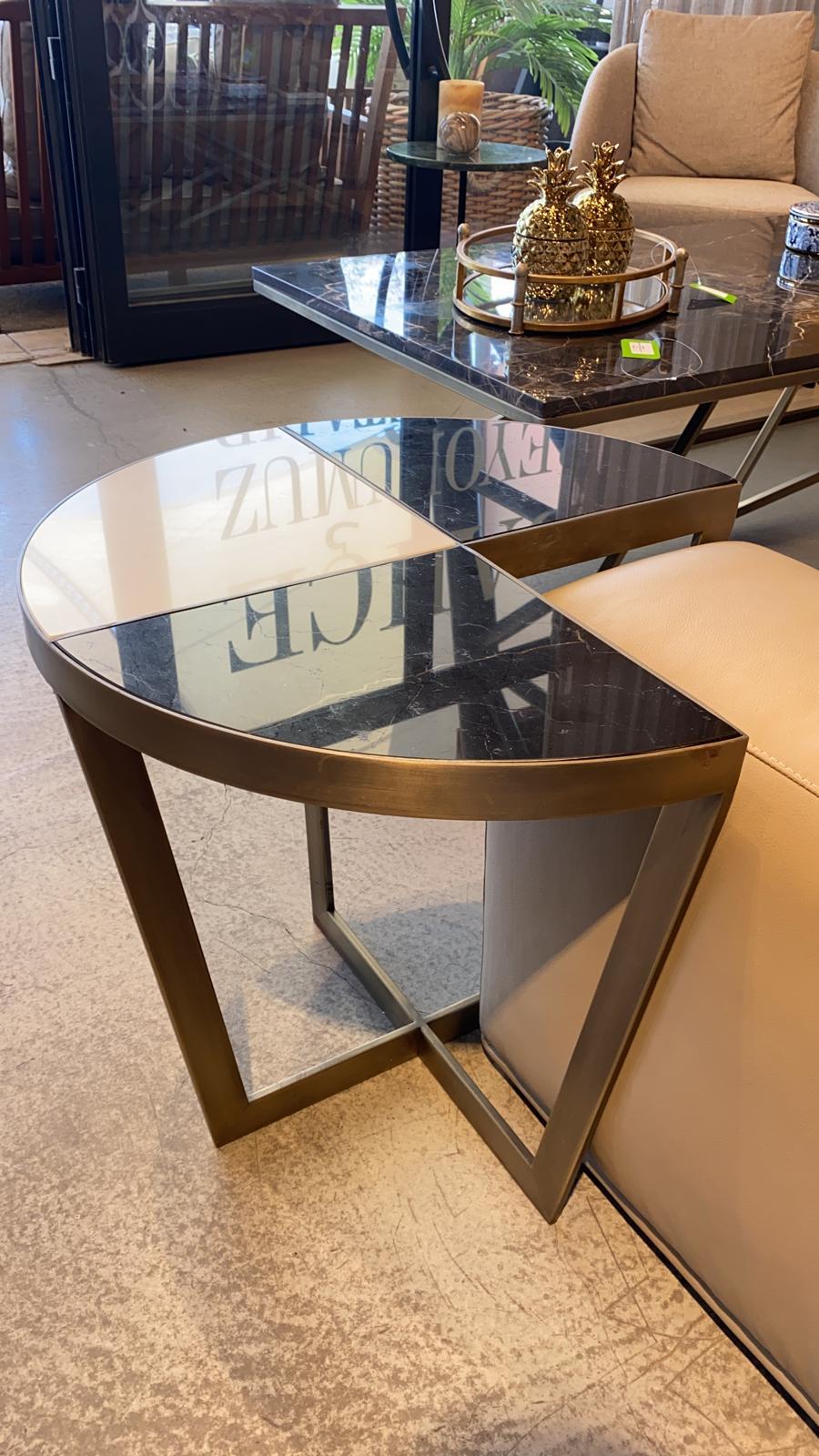 Slice coffe table is the perfect companion for your coffee mug and couch. Just another perfect addition to your home from Marble Studio. Metal leg design and material can be crafted to your specifications. Dimensions and shape can be altered according to your requirements.