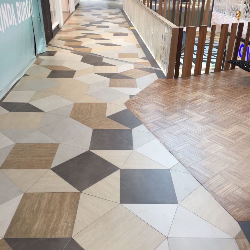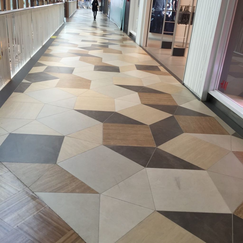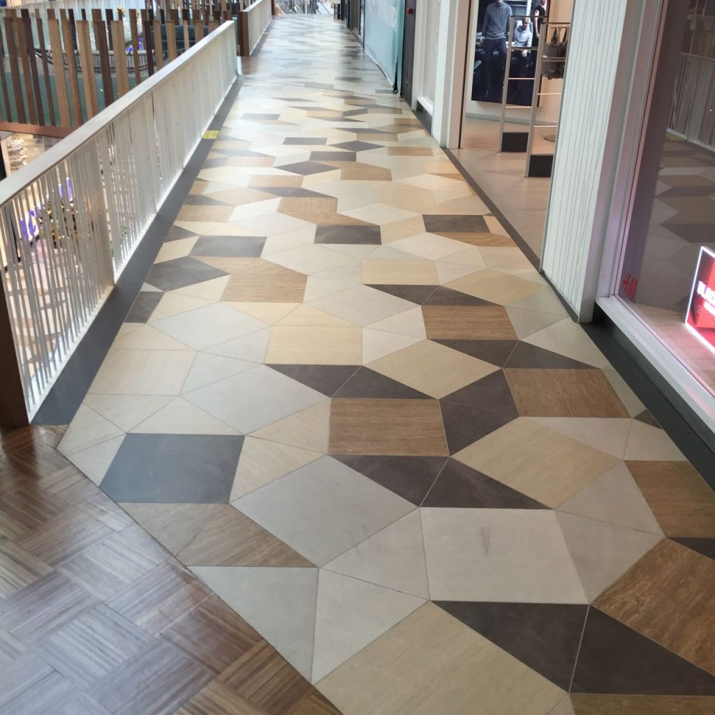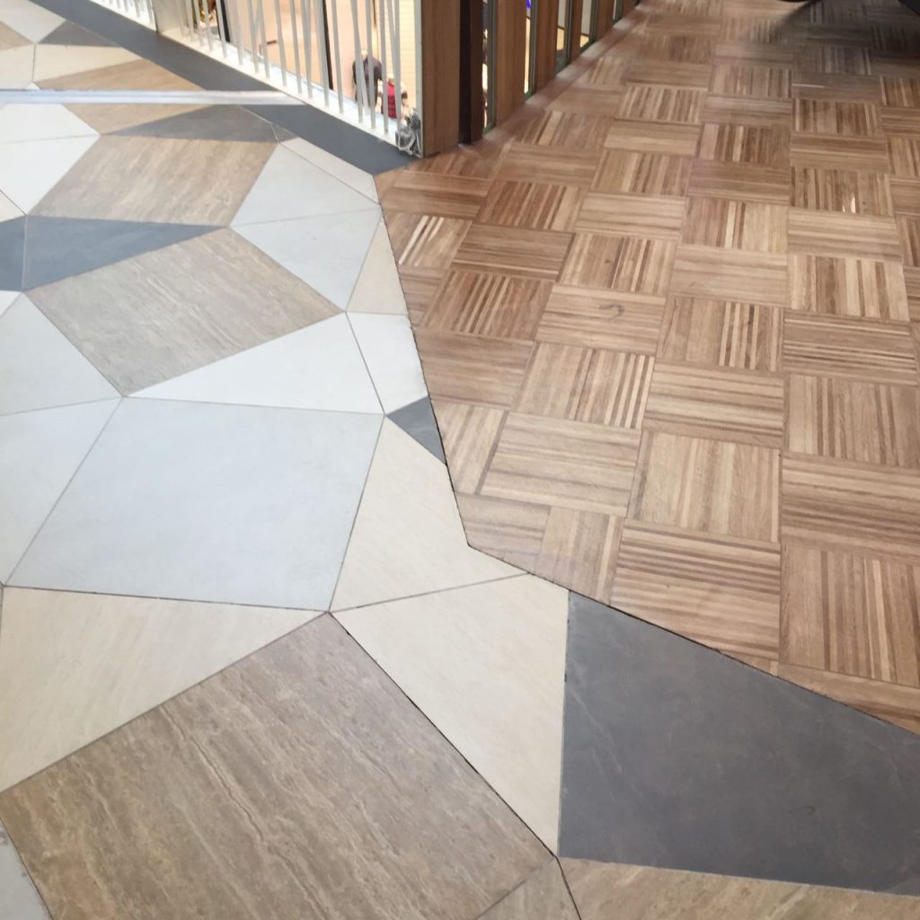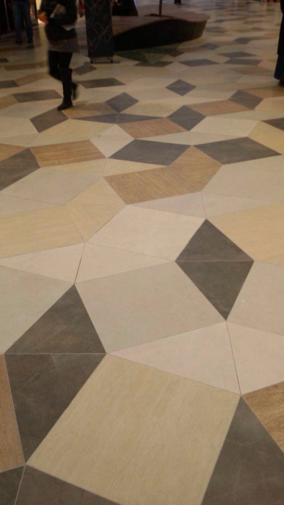 – Modular ceramic tile and Walnut Travertine floor covering.