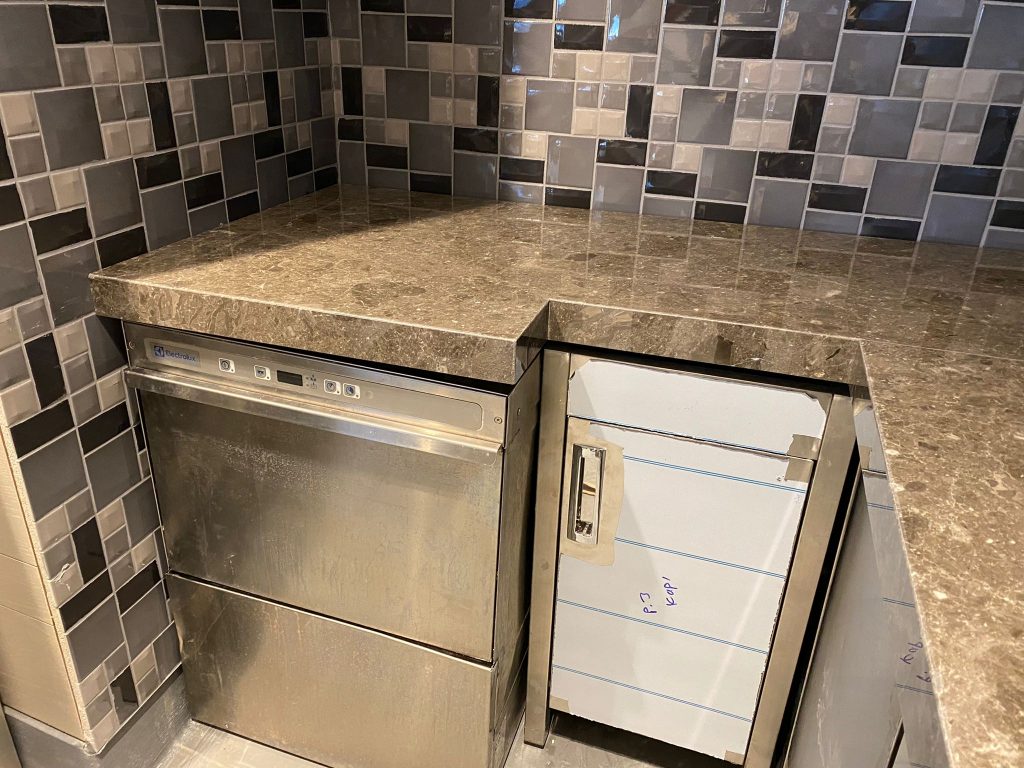 – Custom made cafe countertops with Deep Grey marble.