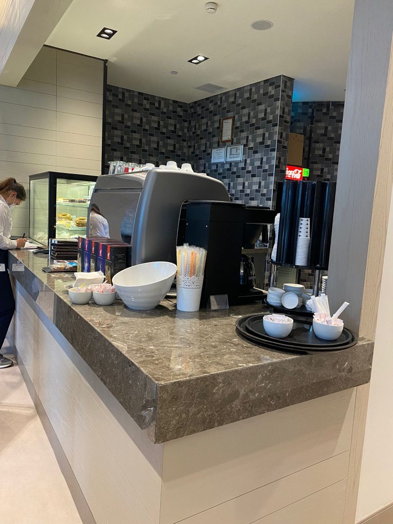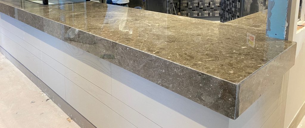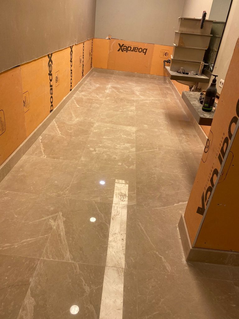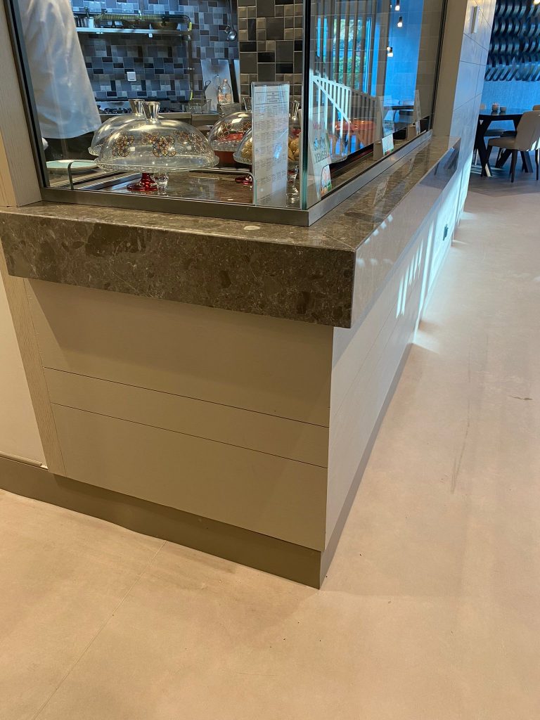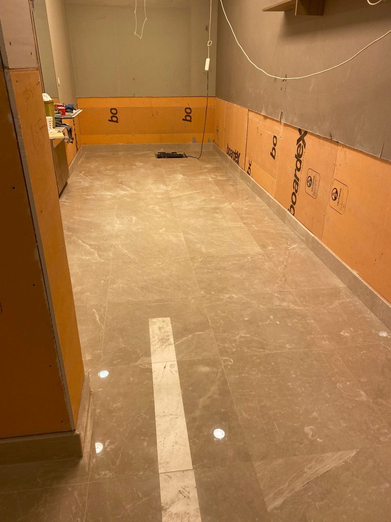 – Hairdresser area floor covering and skirtings with Lunar Beige marble.