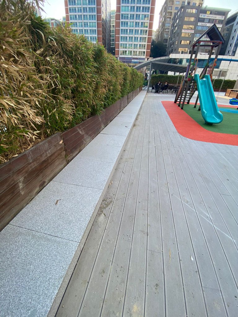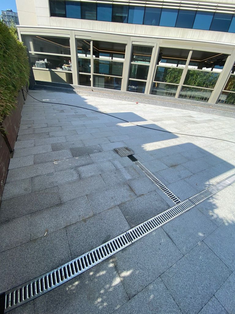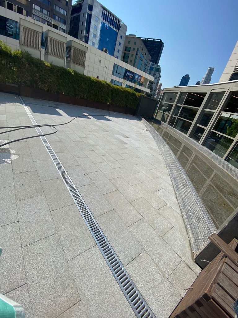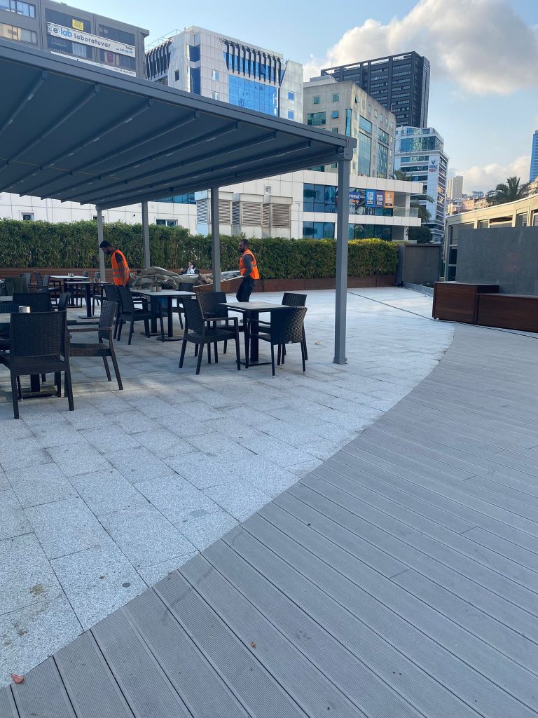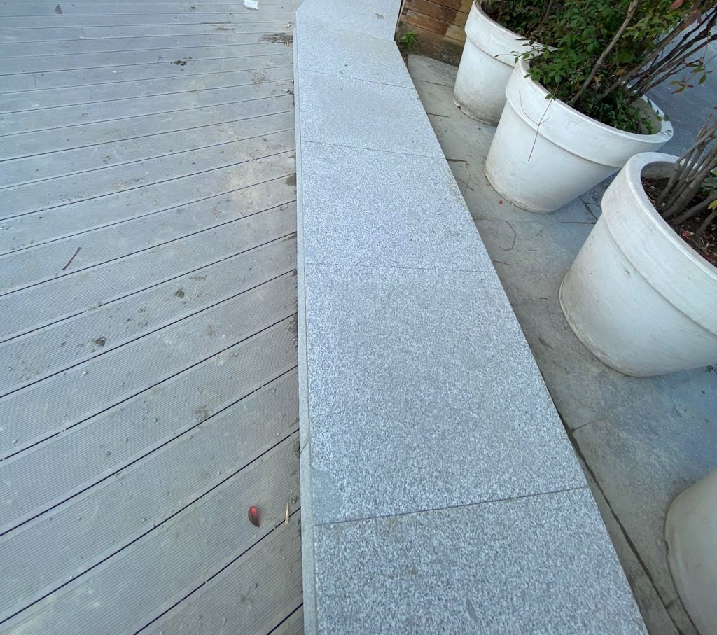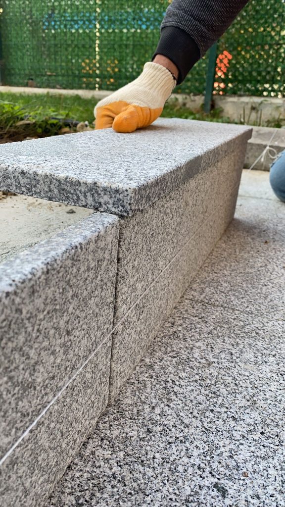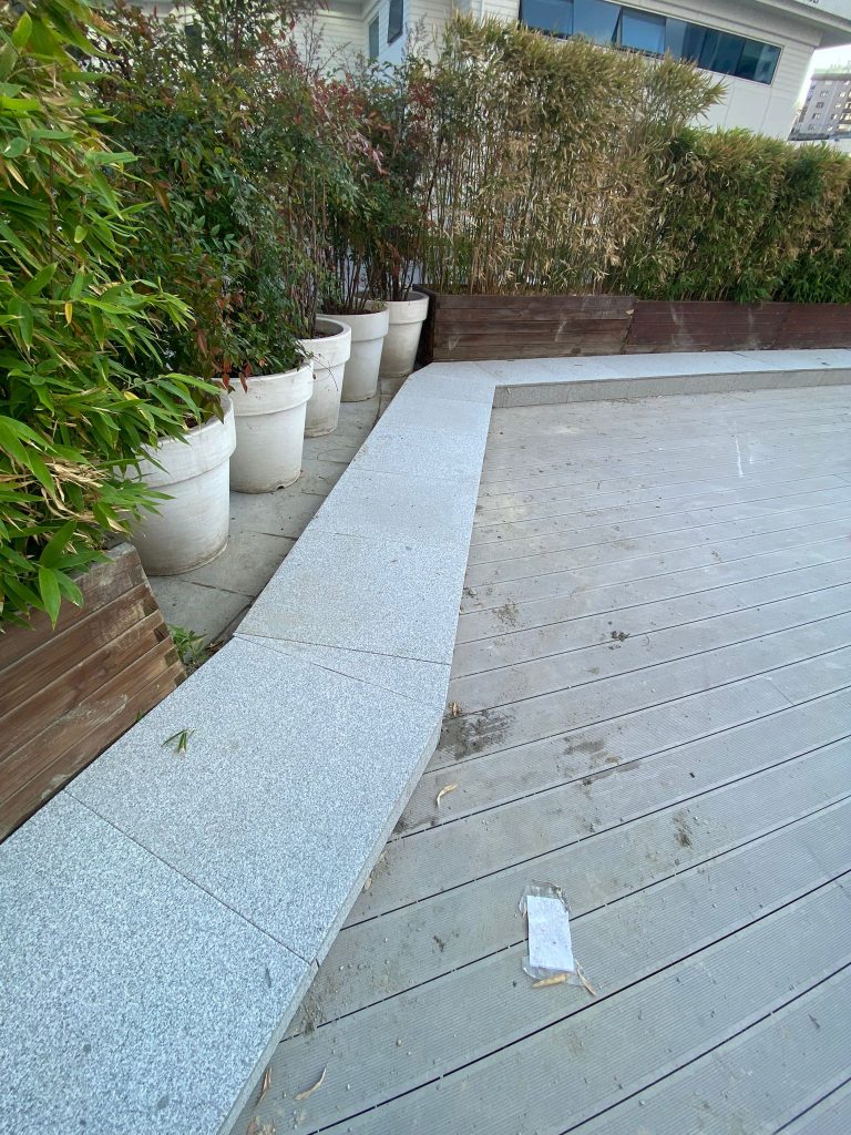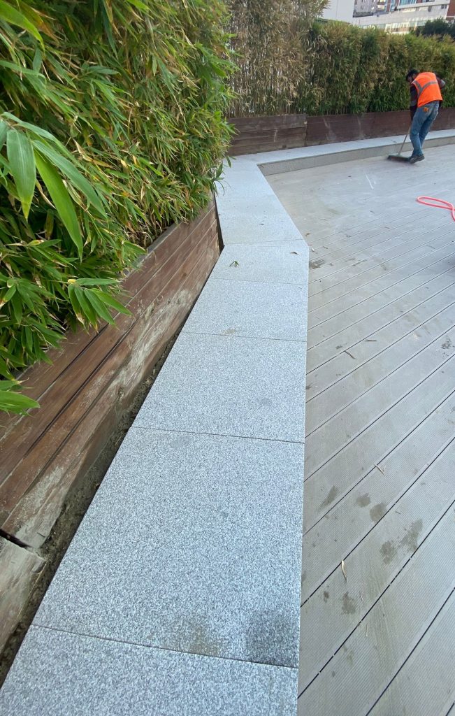 – Exterior cafe terrace floor and pavement covering with Sandblasted Beta Granite.
