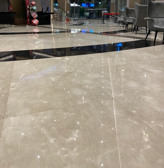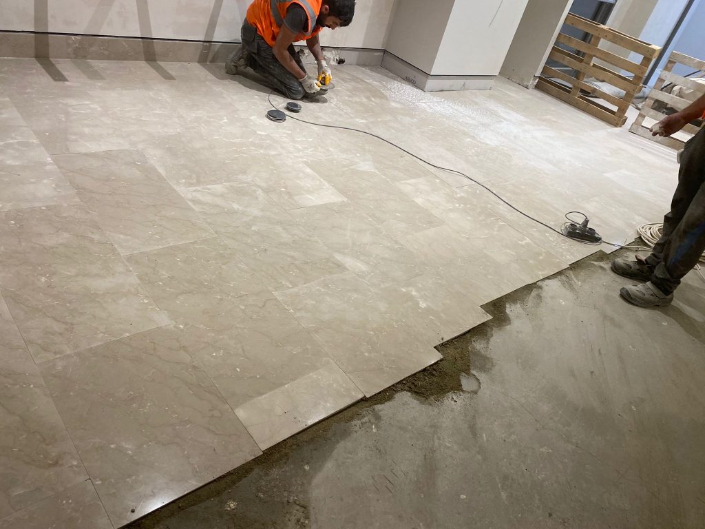 – 96 pieces of bathroom floor and wall coverings, thresholds, general floor coverings throughout the hospital with Mona Beige marble. Custom made waterjet cut sinks with Deep Grey marble.