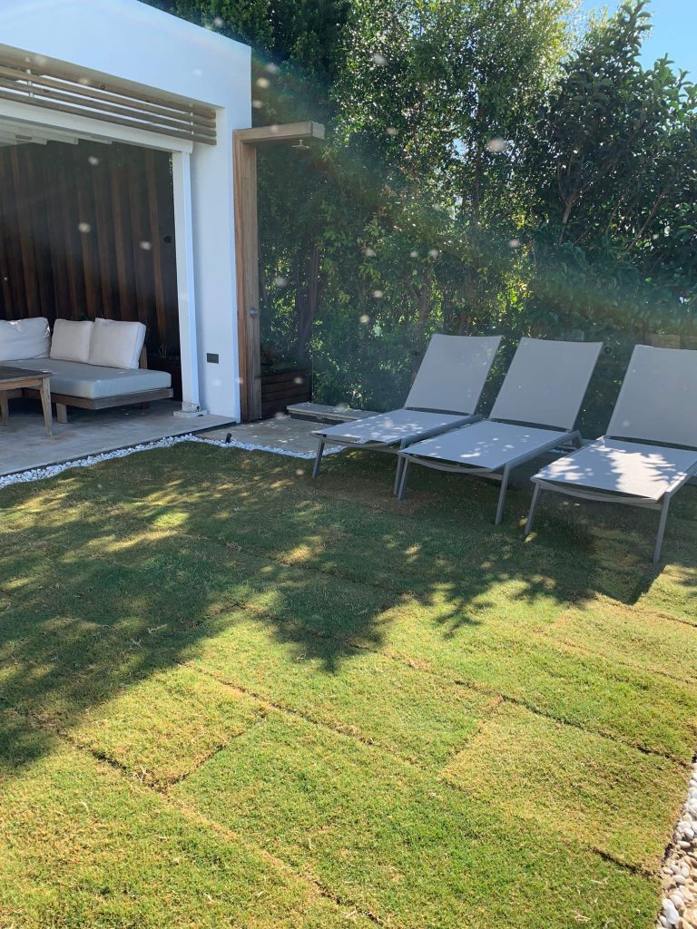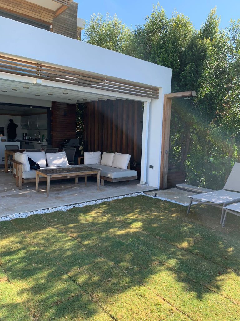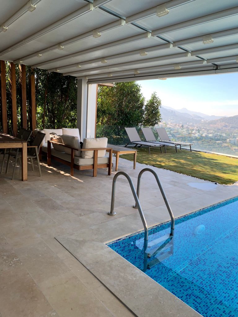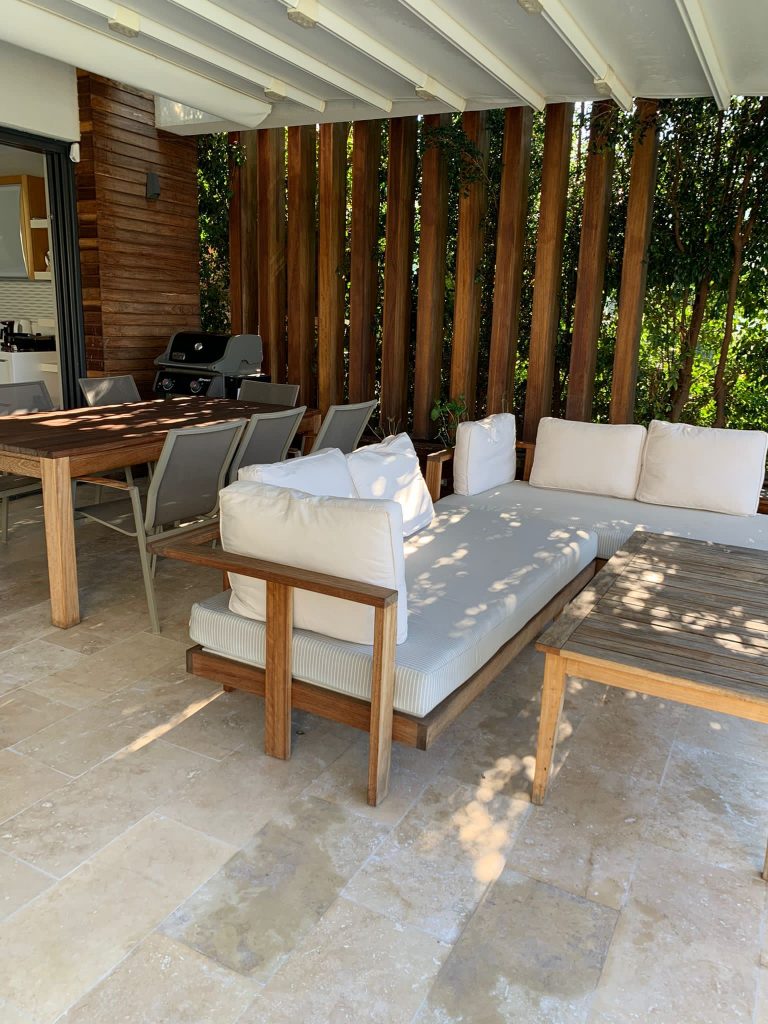 – Exterior patio and steps with Walnut Travertine.