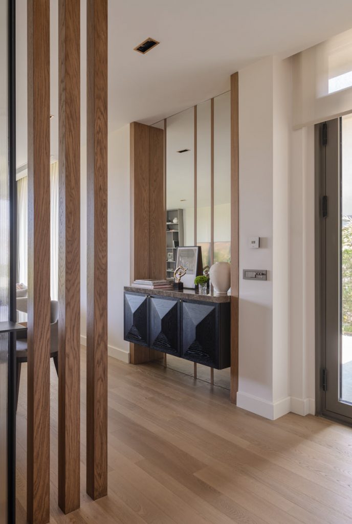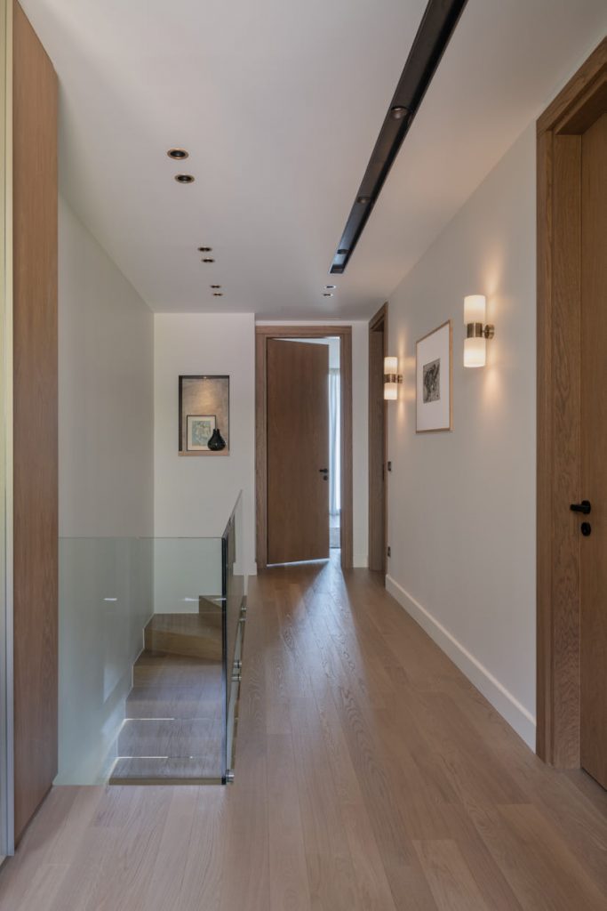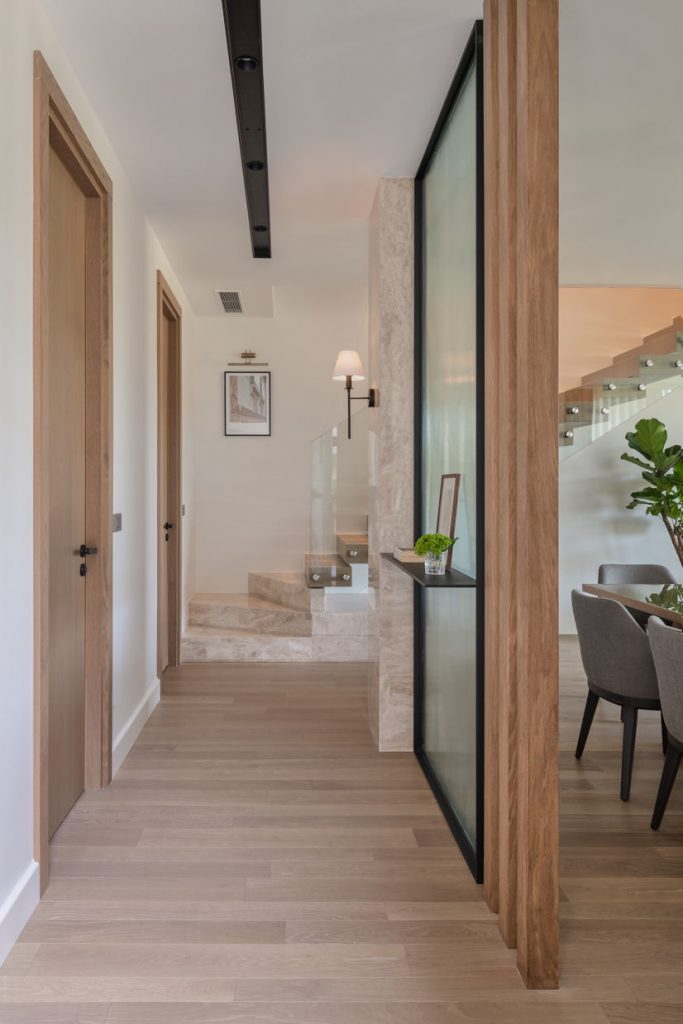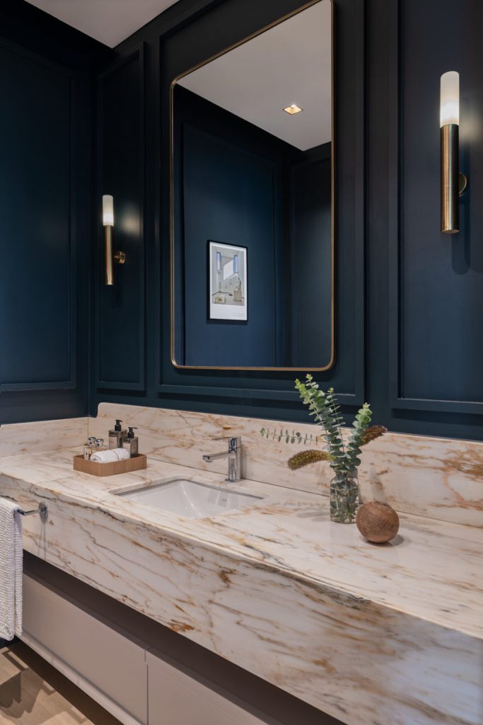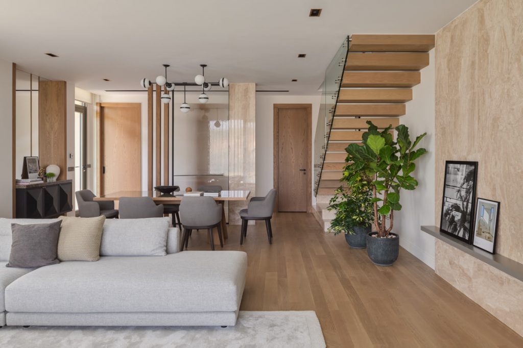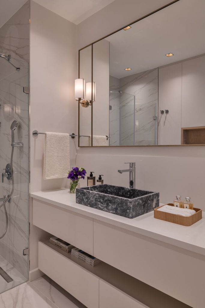 Interior console column, TV unit and stair coverings with Royale Beige and Empress Grey marbles. Bathroom countertop with Calacatta Giallo marble.