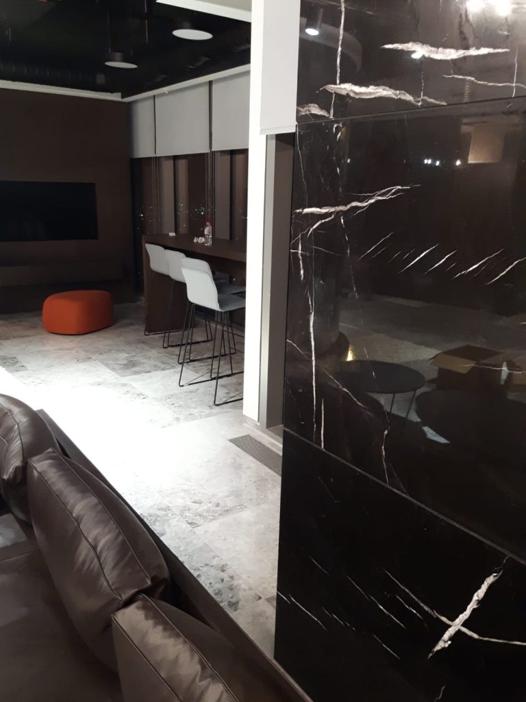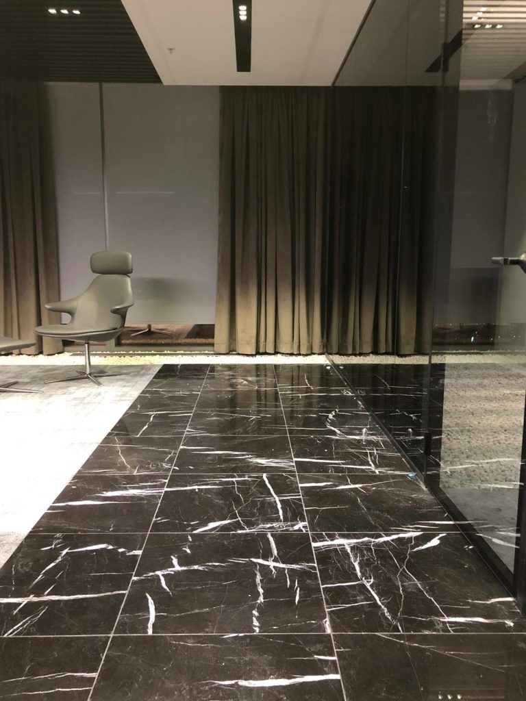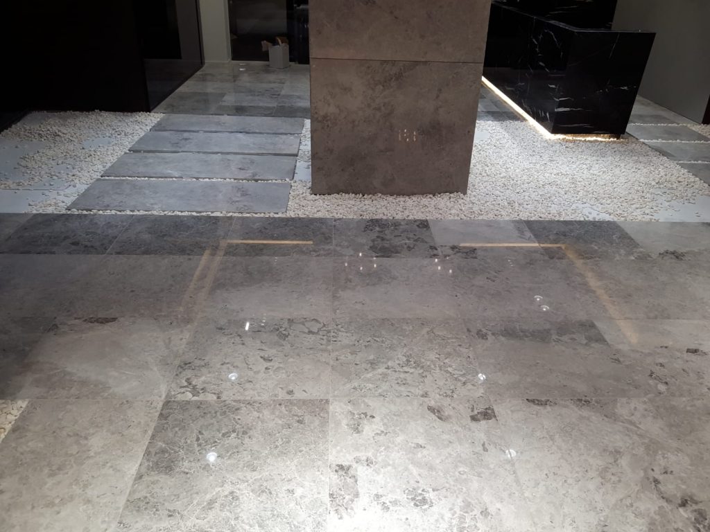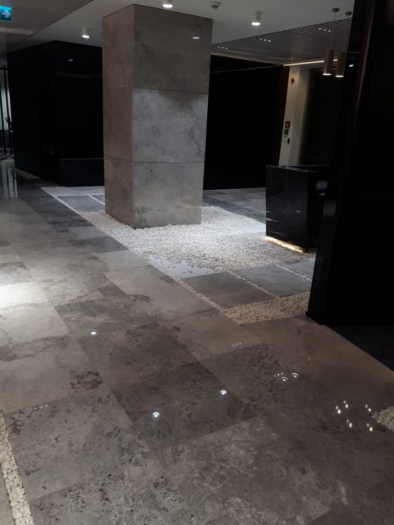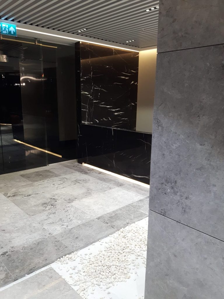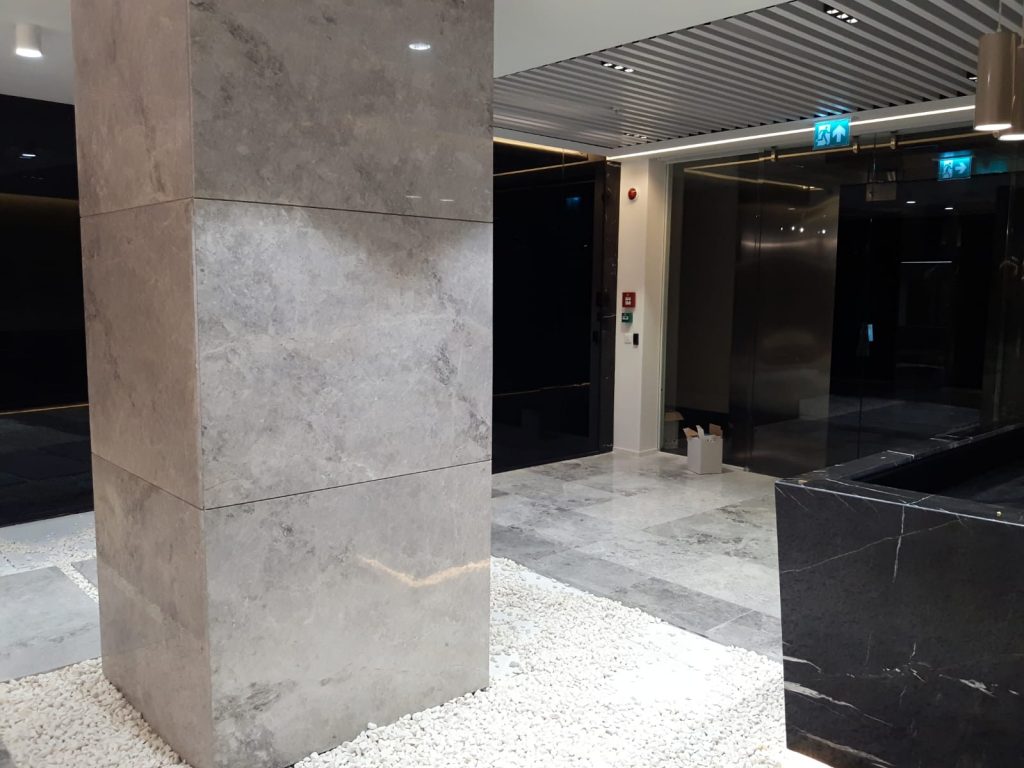 – Floor and column coverings with Antony Grey and Black Line marbles.