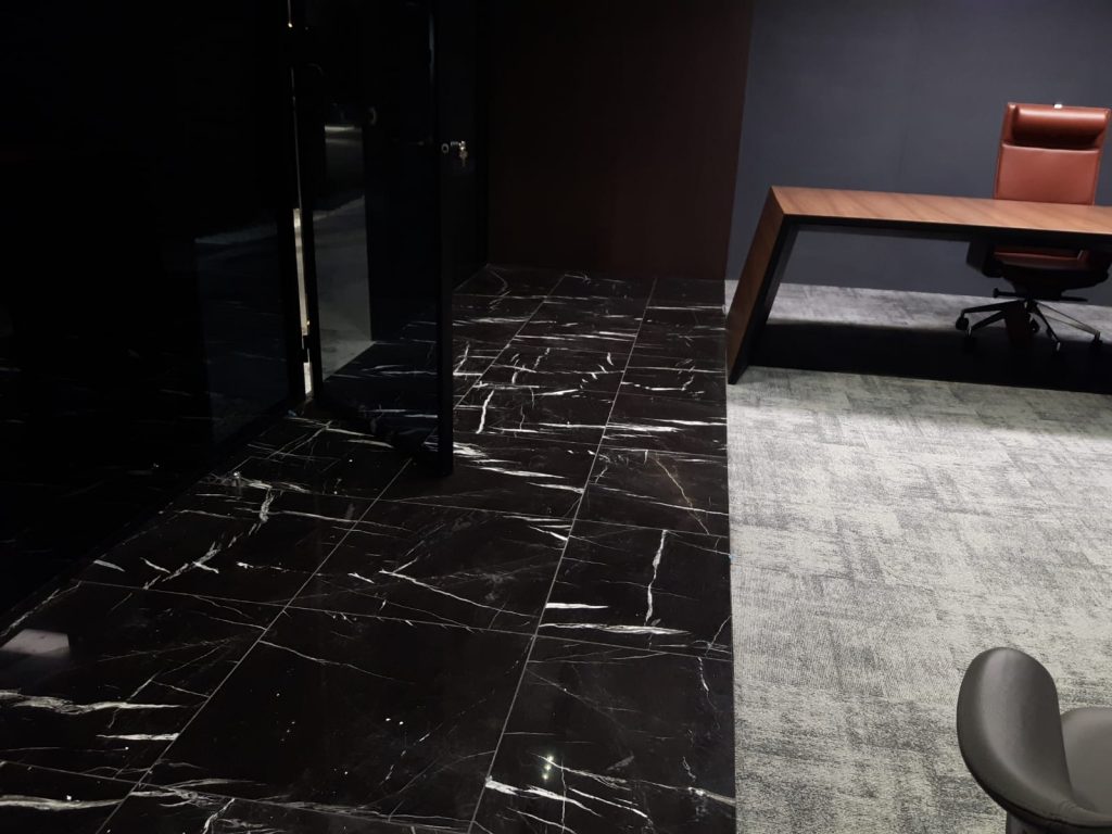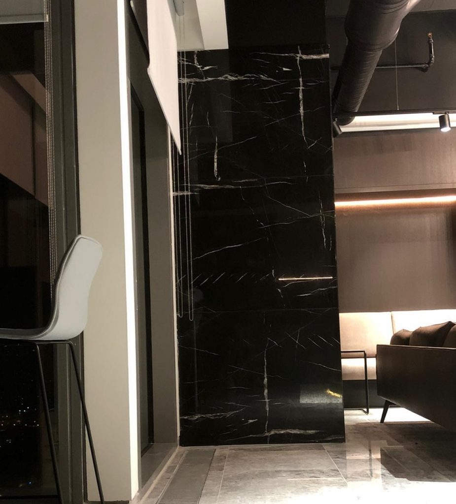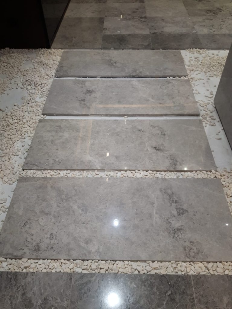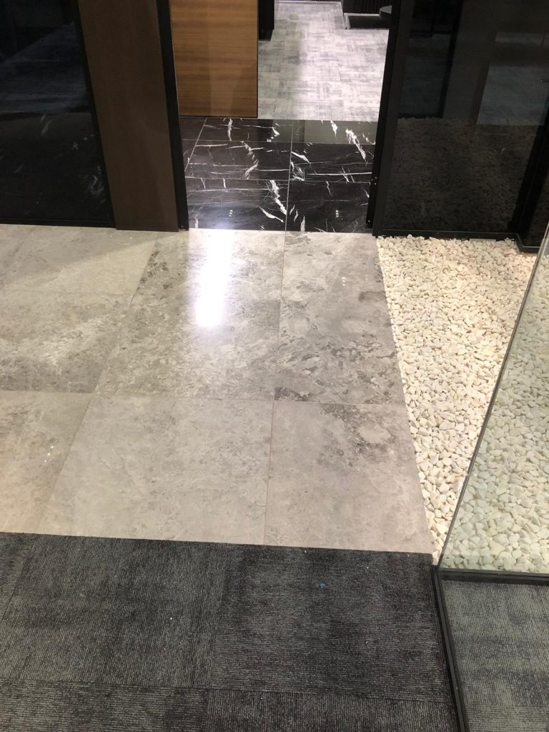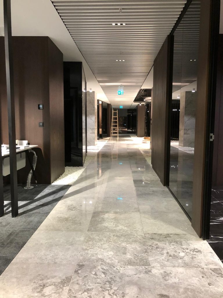 – Floor and column coverings with Antony Grey and Black Line marbles.