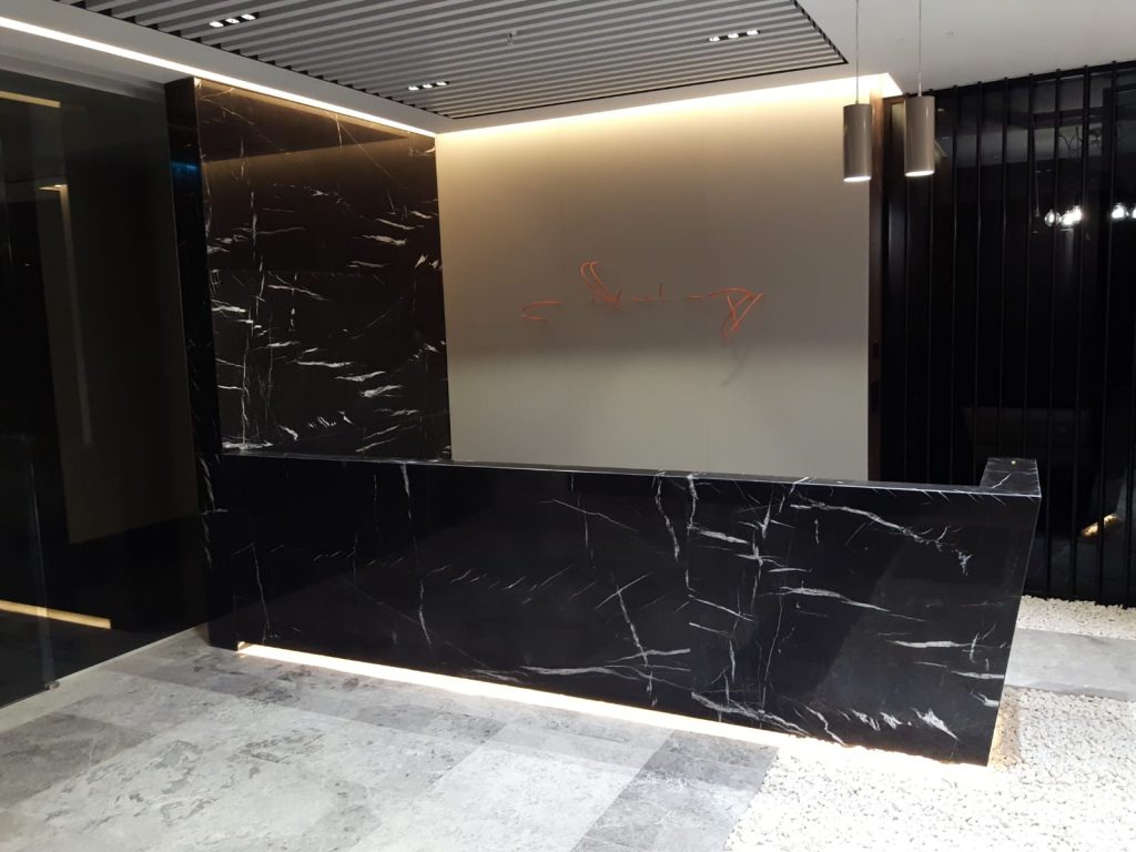 – Reception desk and countertop coverings with Black Line marble.
