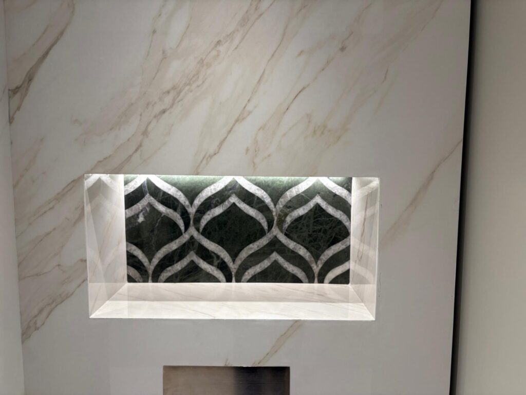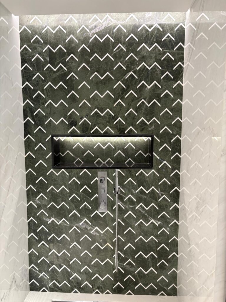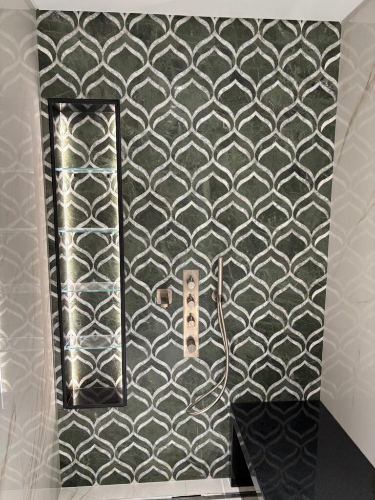 Bespoke mosaic wall panel works with Eleos Green Marble, Thassos Marble and Cristallo Quartzite.