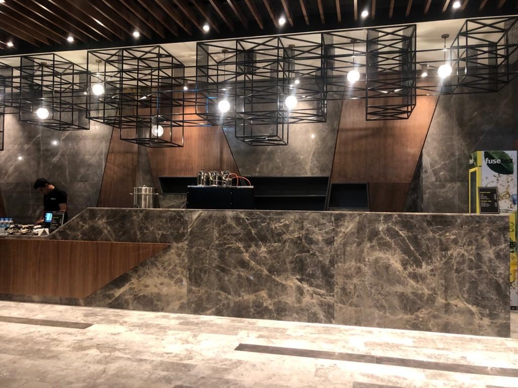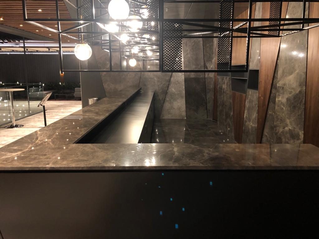 – Flooring with Sardinia Grey and Frozen Grey marble.