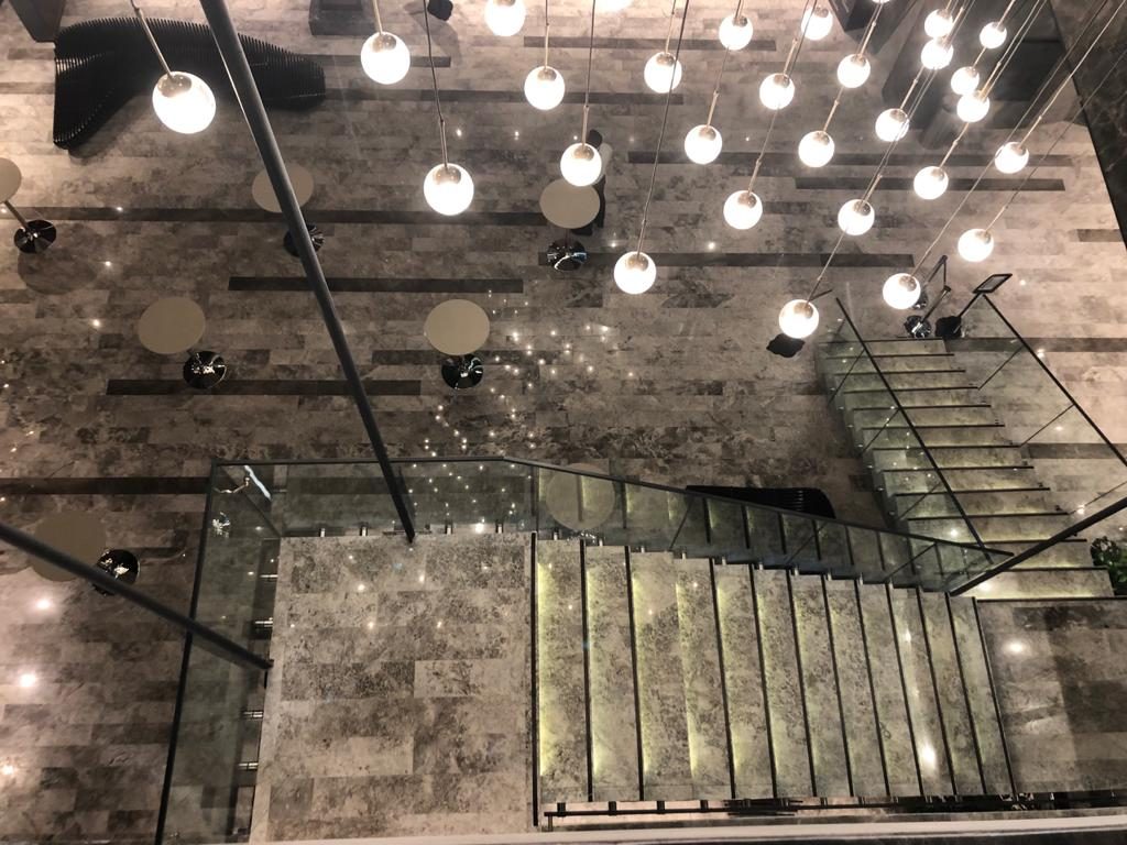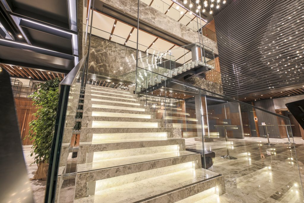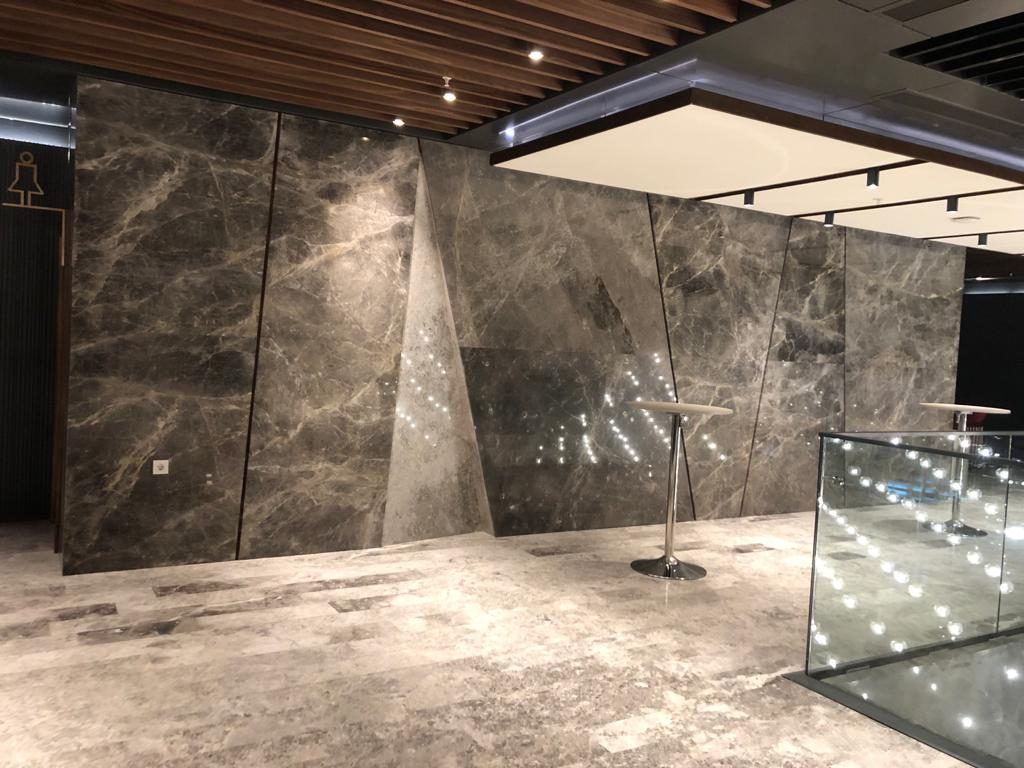 – Stairs, complete interior wall cladding and elevator wall coverings with Frozen Grey marble.