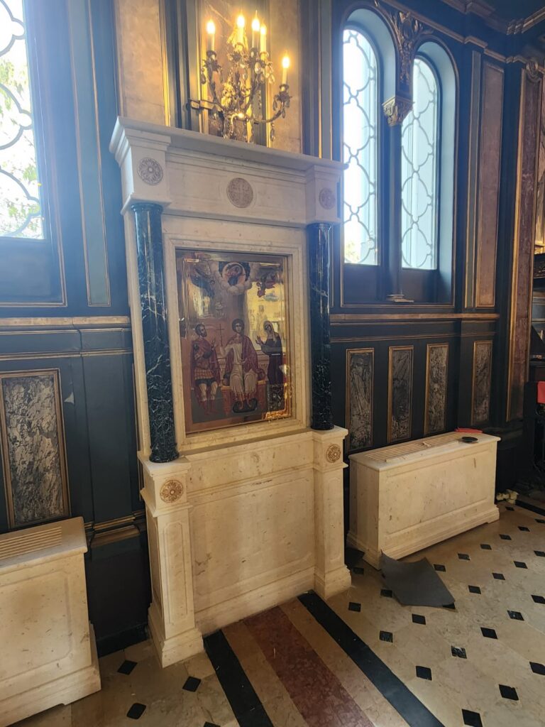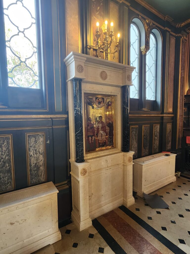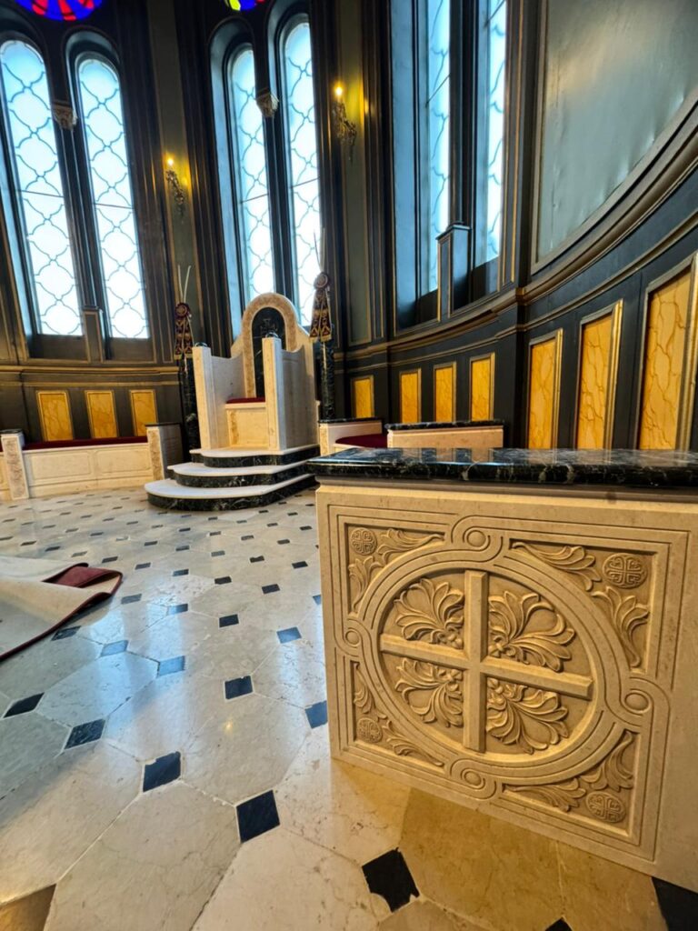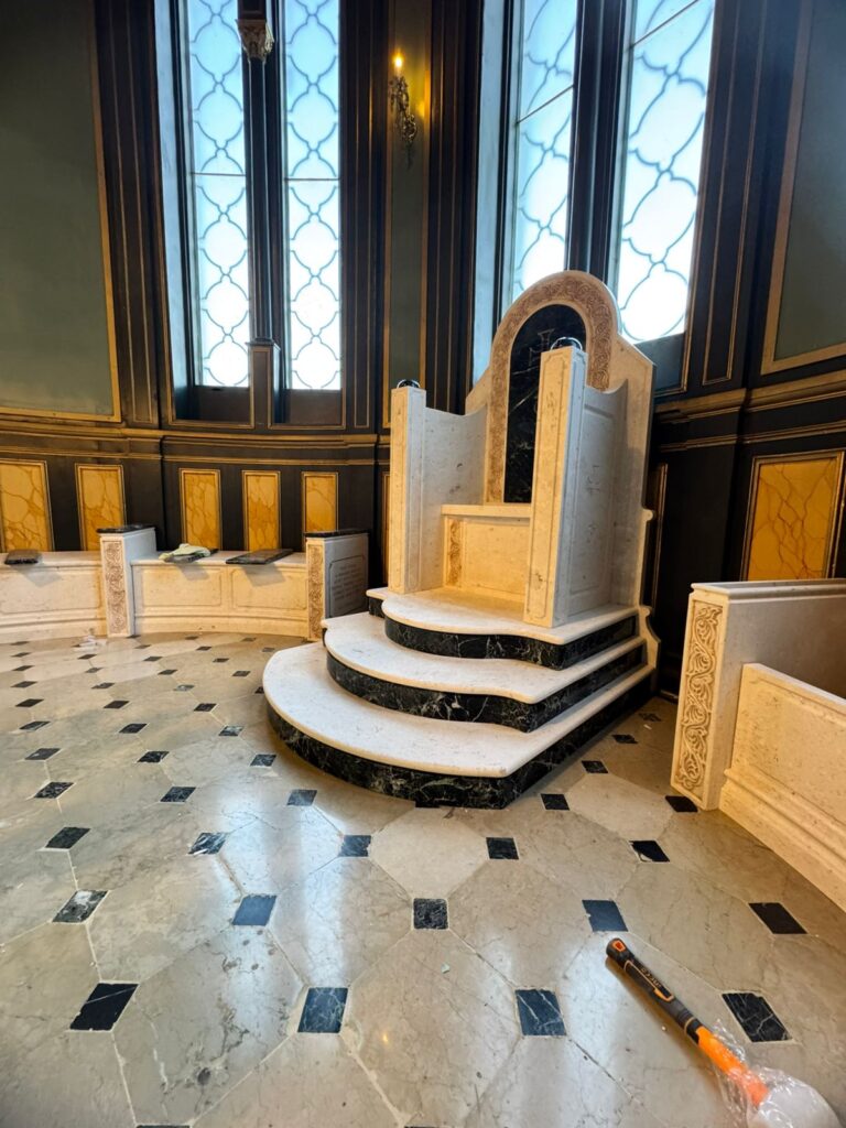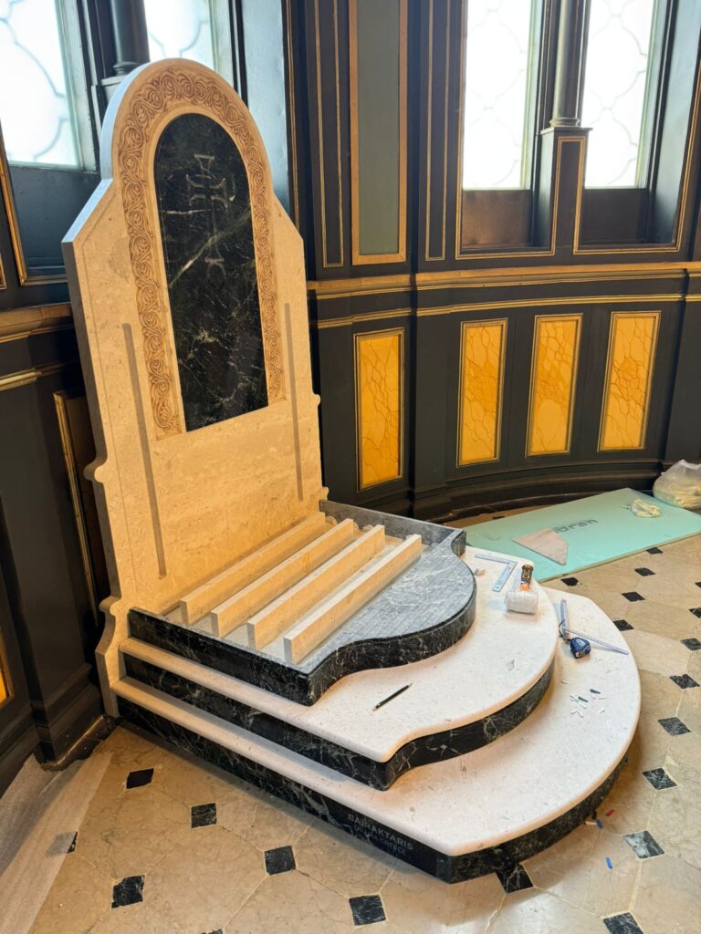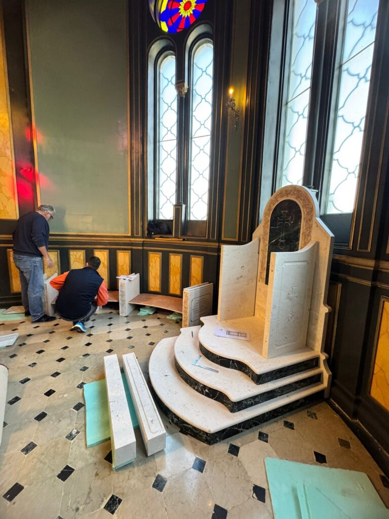 Marble altar and step installations with Greek Beige and Green marbles.