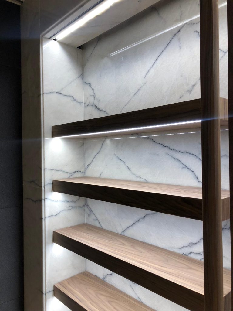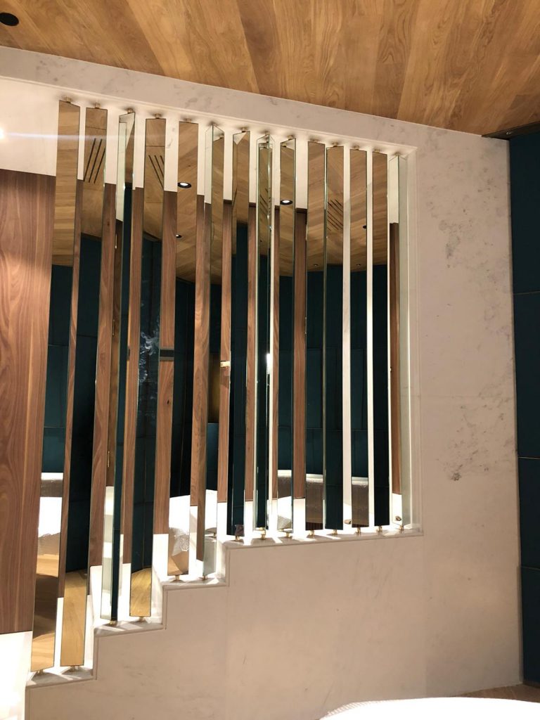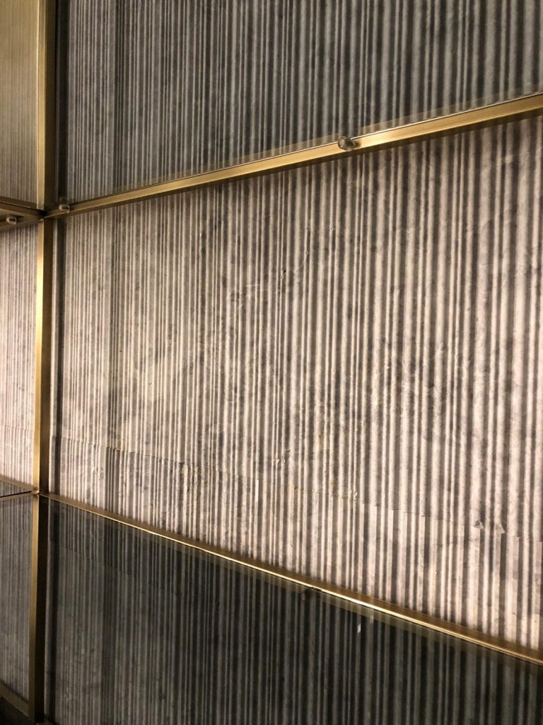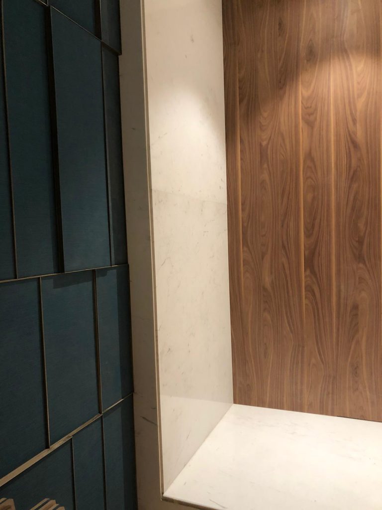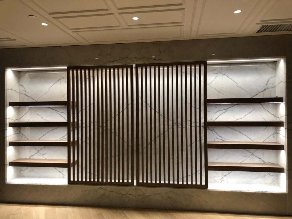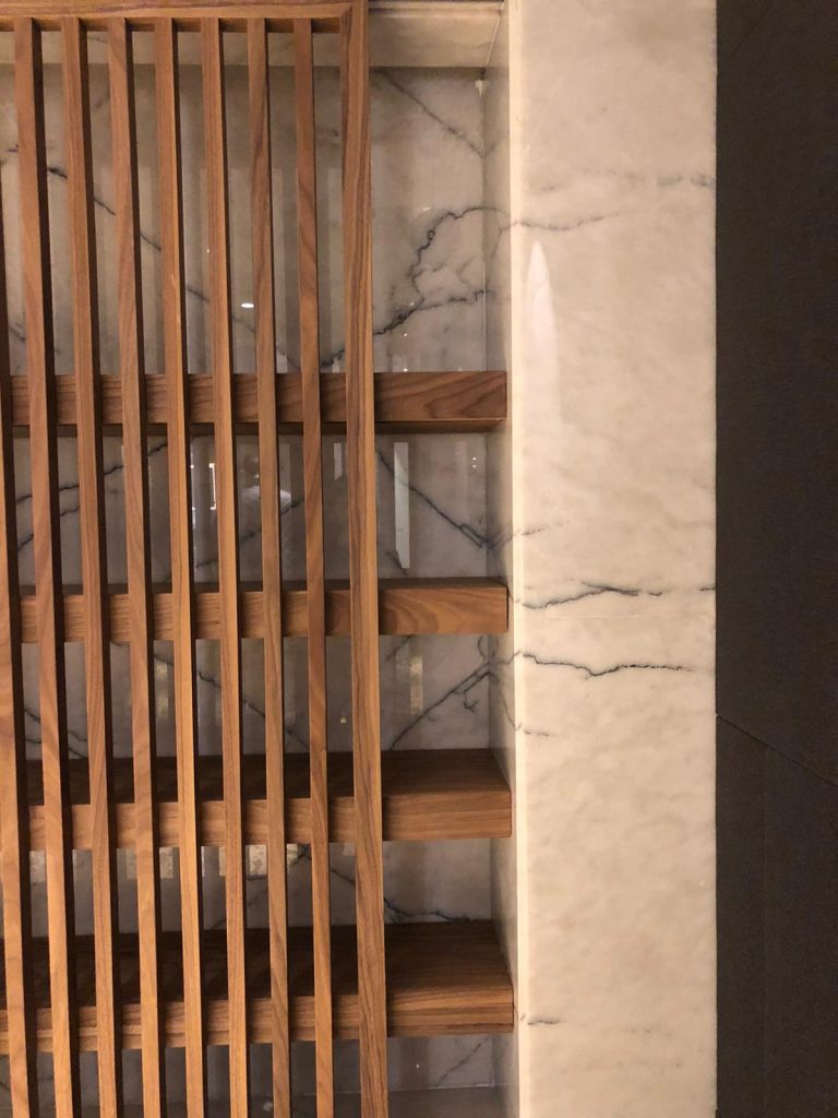 – Meeting area back wall with corrugated Sardinia Grey marble.