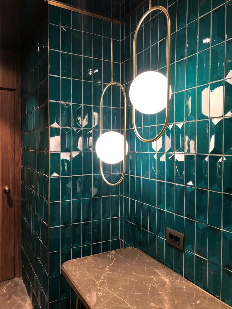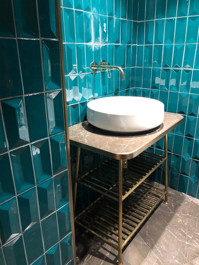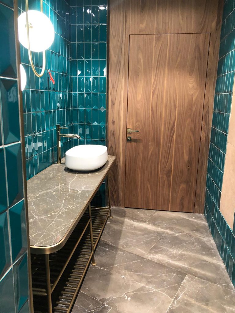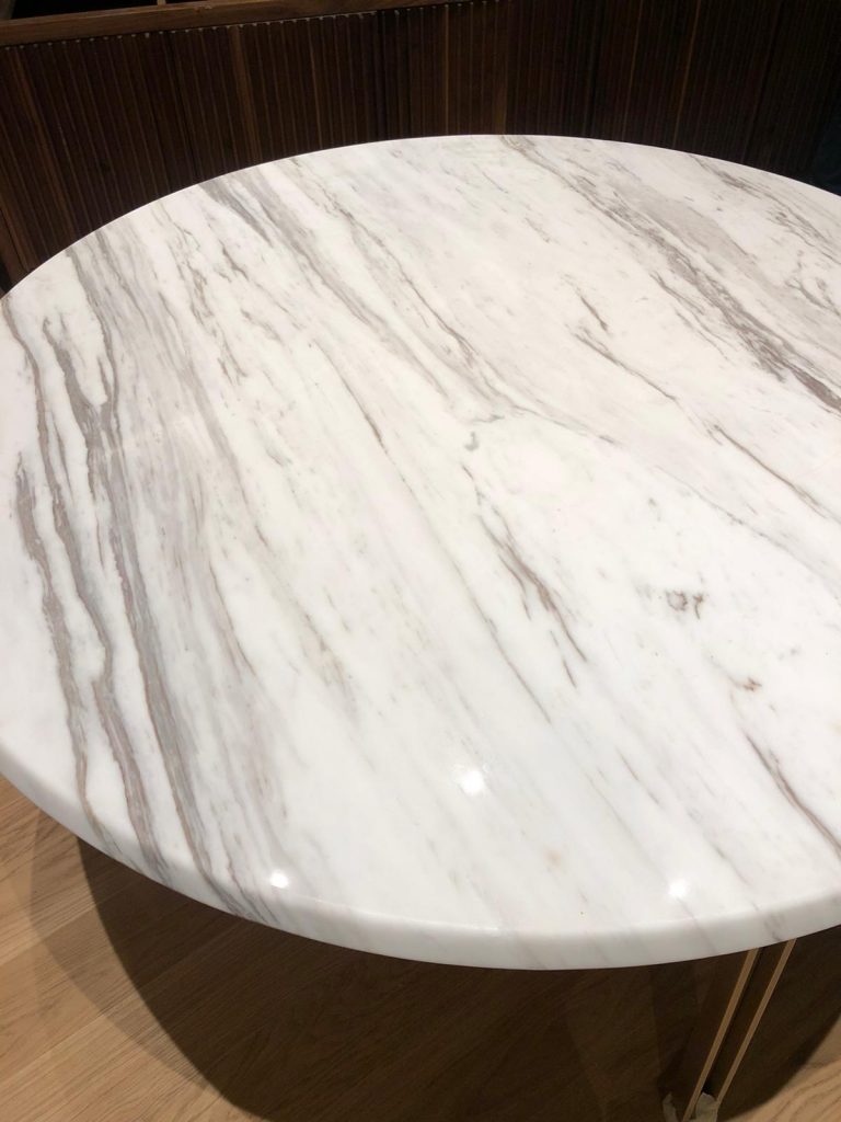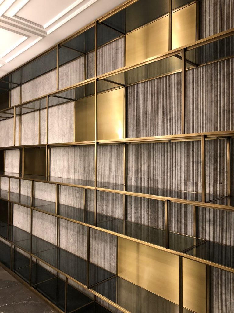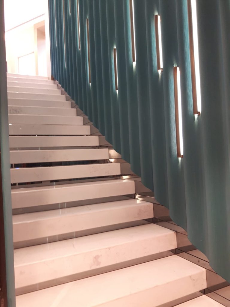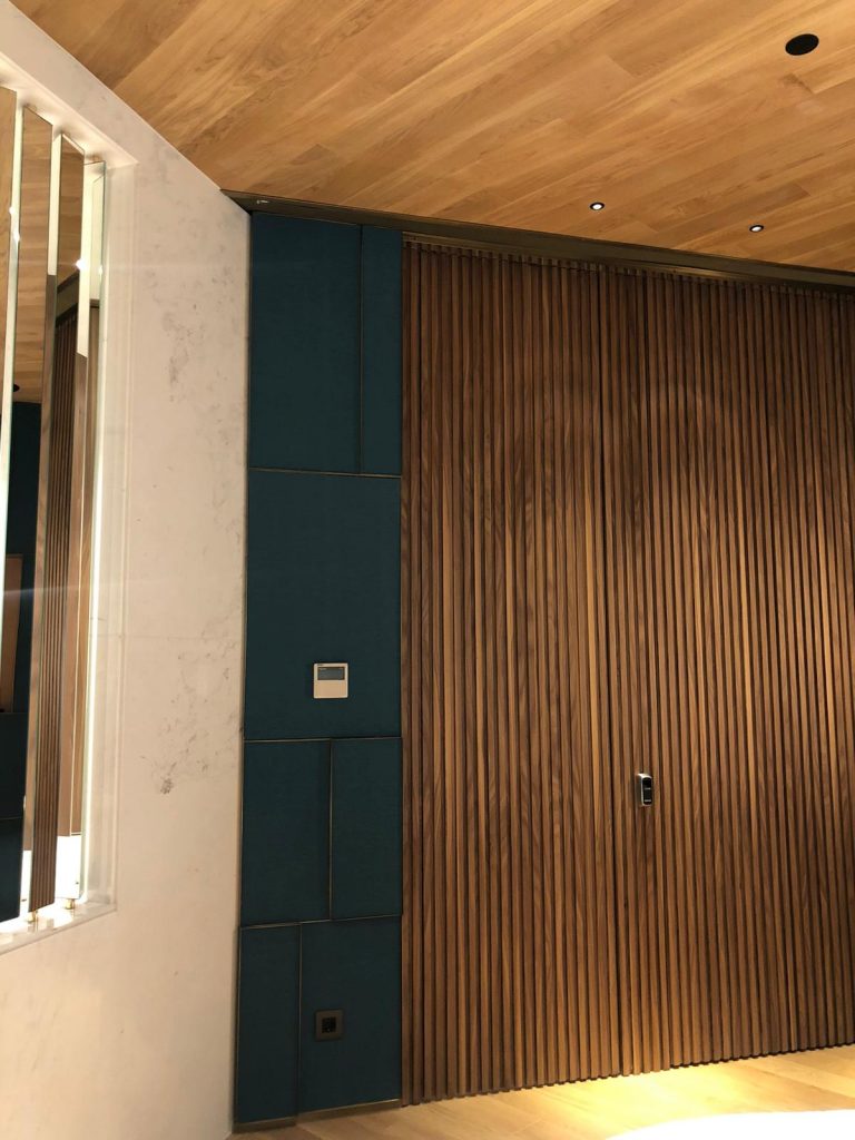 – Meeting area back wall with corrugated Sardinia Grey marble.